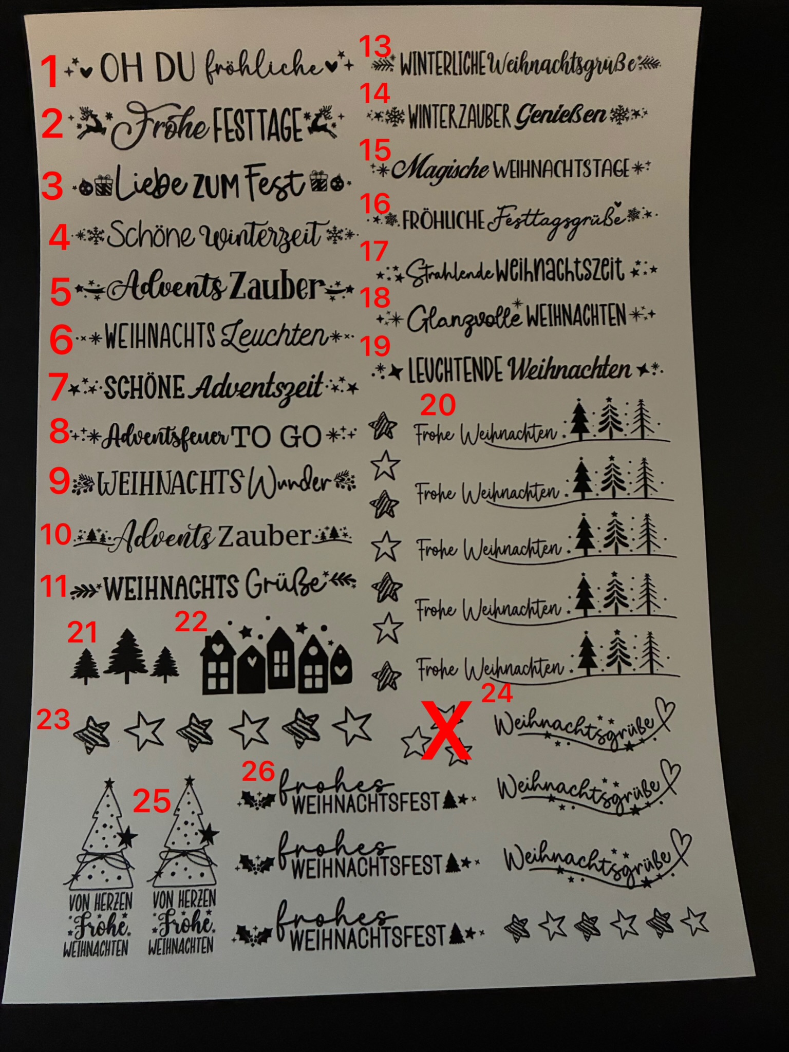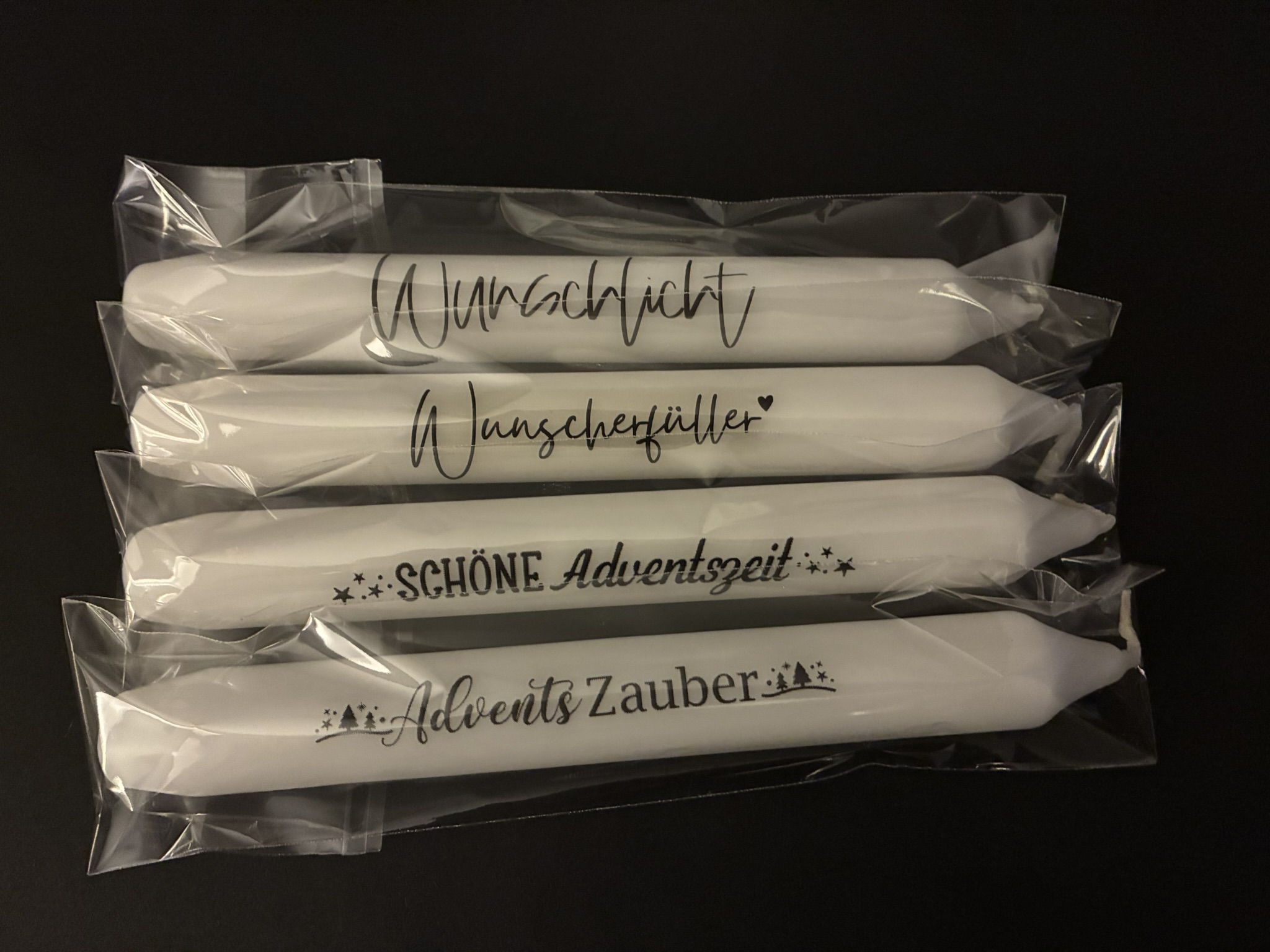 | Stabkerzen | 1 – Oh du fröhliche, 2 – Frohe Festtage, 3 – Liebe zum Fest, 4 – Schöne Winterzeit, 5 – AdventsZauber, 6 – Weihnachtsleuchten, 7 – Schöne Adventszeit, 8 – Adventsfeuer to go, 9 – Weihnachtswunder, 10 – Adventszauber, 11 – Weihnachtsgrüße, 13 – Winterliche Weihnachtsgrüße, 14 – Winterzauber genießen, 15 – Magische Weihnachtstage, 16 – Fröhliche Festtagsgrüße, 17 – Strahlende Weihnachtszeit, 18 – Glanzvolle Weihnachten, 19 – Leuchtende Weihnachten, 20 – Frohe Weihnachten, 21 – Bäume, 22 – Häuser, 23 – Sterne, 24 – Weihnachtsgrüße, 25 – Von Herzen Frohe Weihnachten, 26 – frohes Weihnachtsfest, 27 – Wunschlicht, 28 – Wunscherfüller, 29 – Wunschlicht, 30 – Wunscherfüller, 31 – kleiner Wunscherfüller, 32 – kleiner Wunscherfüller |